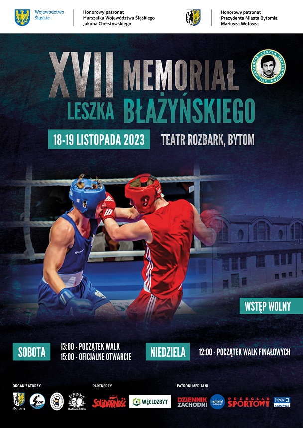 W sobotę i niedzielę (18-19 listopada) w Teatrze Rozbark w Bytomiu odbędzie się XVII Międzynarodowy Memoriał Leszka Błażyńskiego. Najzdolniejsi polscy pięściarze będą rywalizować z mocnymi bokserami m.in. z Ukrainy, Anglii i Czech. Pojedynki będzie obserwował legendarny Marian Kasprzyk. Wstęp na turniej upamiętniający dwukrotnego medalistę olimpijskiego jest bezpłatny.