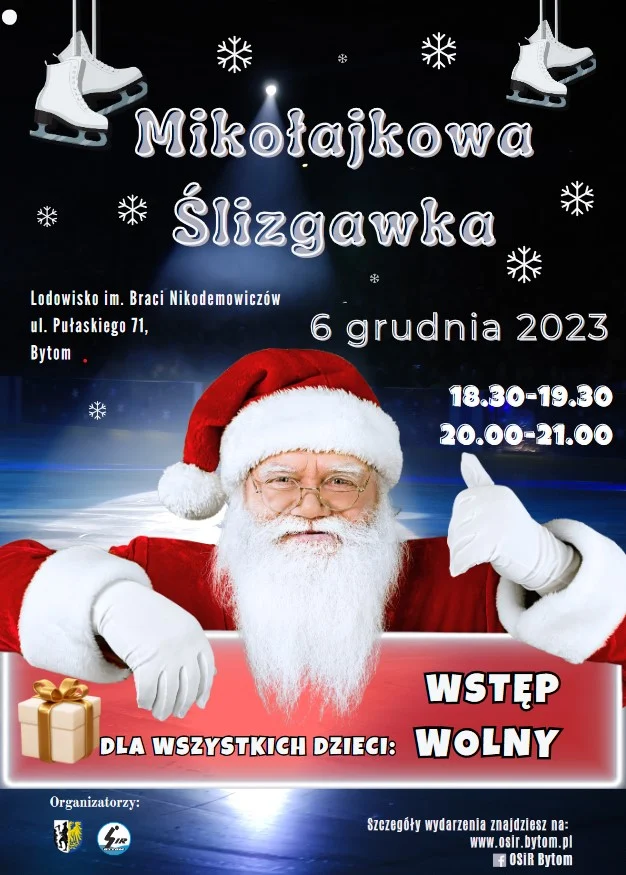 Podczas Mikołajkowej Ślizgawki na Lodowisku im. Braci Nikodemowiczów, będzie możliwość zrobienia zdjęcia w Mikołajkowej Ramce. Wśród osób, które opublikują post z fotką w ramce na FB i jednocześnie odznaczą Osir Bytom rozlosowane zostaną dwa vouchery (10 wejść na lodowisko). Zapraszamy do zabawy!