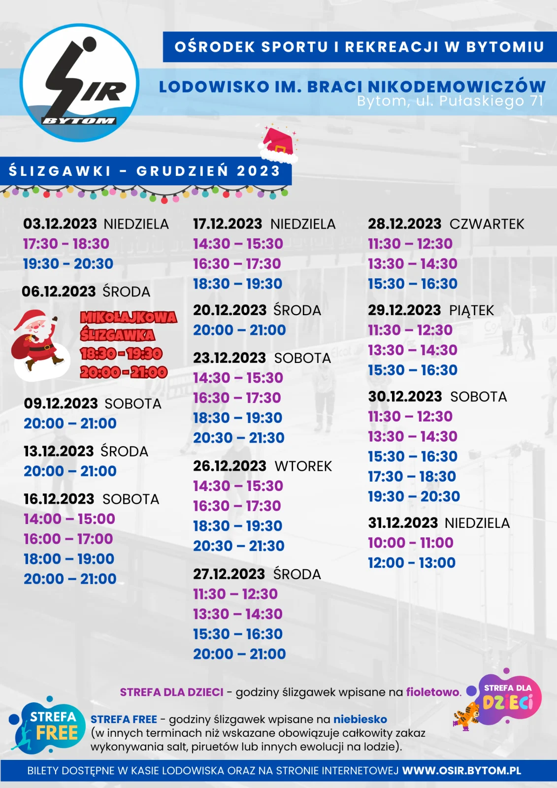 Szczegółowy harmonogram lodowiska sezonowego: https://osir.bytom.pl/lodowisko-sezonowe/.