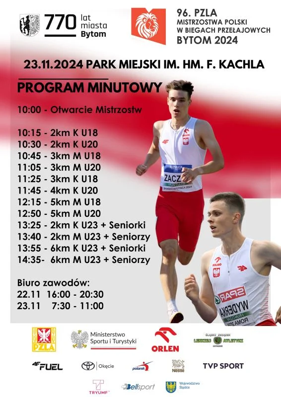 96. PZLA Mistrzostwa Polski w Biegach Przełajowych rozpoczną się w sobotę, 23 listopada o godz. 10.00. Kwadrans później na trasę alejkami w Parku Miejskim im. hm. Franciszka Kachla wybiegną pierwsi lekkoatleci, którzy będą zmagać się z trasą dostosowaną do kategorii wiekowej. W zależności od niej biegacze i biegaczki będą rywalizować na trasie od 2 do 6 km.