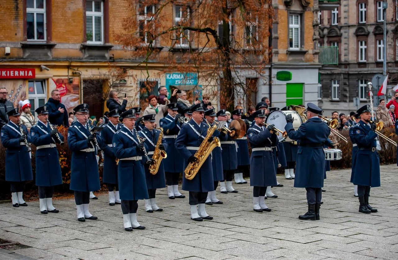Pod Pomnikiem Wolności uczestnicy wraz z wojskową asystą honorową 34. Śląskiego Dywizjonu Rakietowego Obrony Powietrznej w Bytomiu i Orkiestrą Wojskową z Bytomia upamiętnili 107. rocznicę odzyskania niepodległości.
