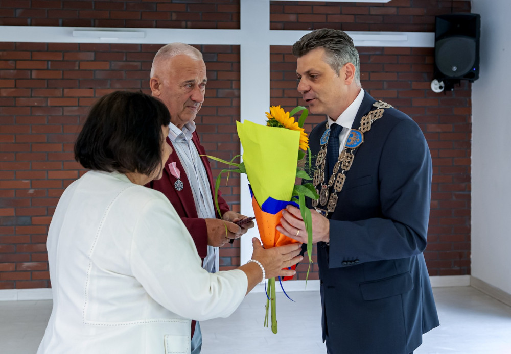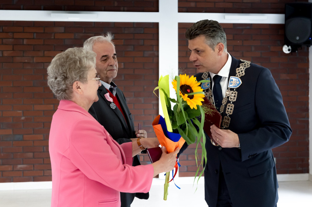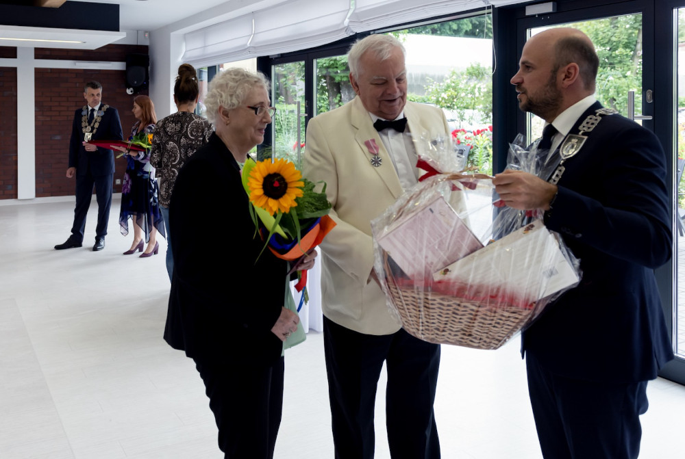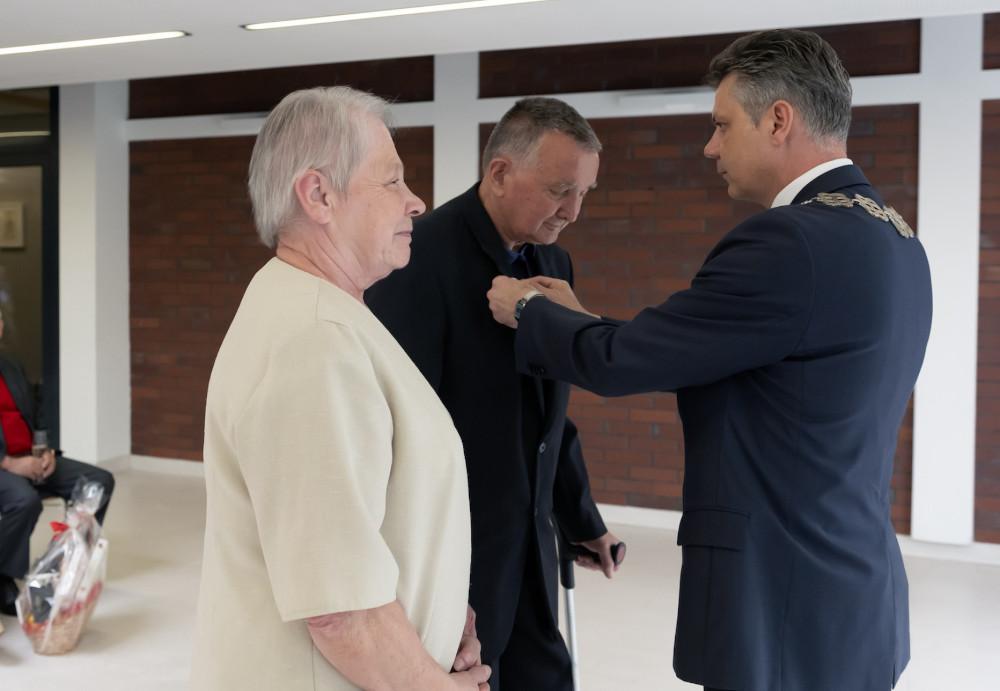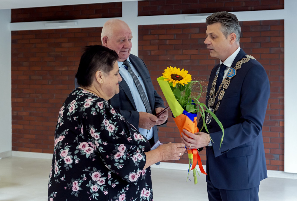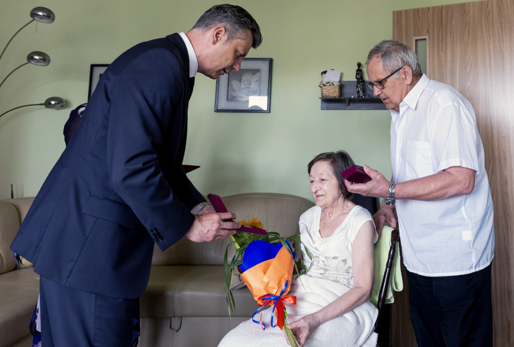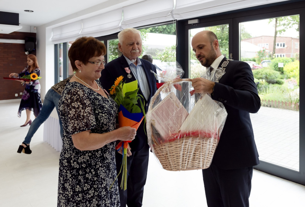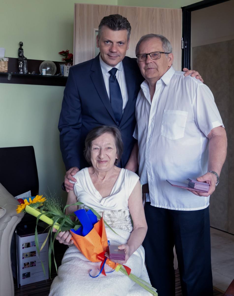 Medal za długoletnie pożycie małżeńskie odebrali także państwo Jadwiga i Jerzy Stelmachowie, których prezydent Mariusz Wołosz odwiedził z życzeniami i kwiatami w ich domu.