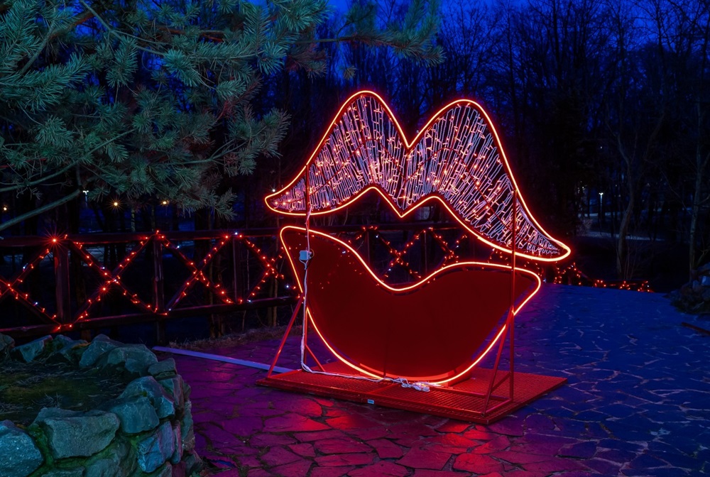 Wśród okolicznościowych dekoracji nie zabrakło też neonu z napisem Góra Miłości oraz wiszącej iluminacji w kształcie serca na latarni. Na szczycie wzniesienia pojawiła się też “grająca ławeczka – całus” idealna do robienia walentynkowych ujęć.