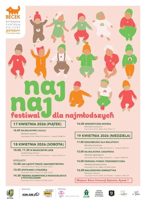 Już w piątek 17 kwietnia w Biurze Promocji Bytomia przy Rynku 7 rozpocznie się Naj Naj Festiwal, czyli trzydniowe wydarzenie przygotowane z myślą o najmłodszych dzieciach i ich opiekunach. W programie znalazły się warsztaty sensoryczne, muzyczne, logopedyczne i ruchowe, spektakl teatralny, zajęcia z pierwszej pomocy oraz wykłady dla rodziców. Festiwal potrwa do niedzieli 19 kwietnia.