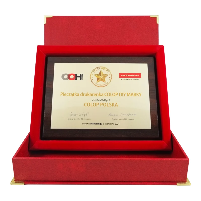 W oparciu o te kryteria pieczątka do odzieży COLOP Diy Marky została uznana za laureata Złotego Medalu Festiwalu Marketingu 2024. Pieczątki Diy Marky dostępne są w trzech kolorach – zielonym, różowym i niebieskim. Wkład z wodoodpornym tuszem do tekstyliów jest zawsze czarny. Pieczątka działa jako drukarenka, co pozwala na wielokrotną zmianę treści odbicia. W zestawie znajdują się czcionki zpolskimi znakami, cyframi i symbolami, umożliwiające pełną personalizację.