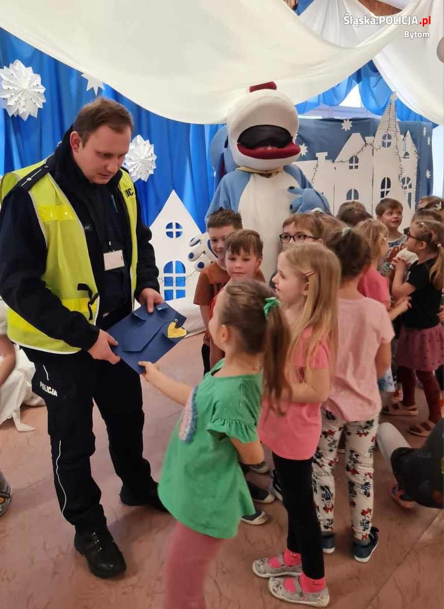 Wczoraj bytomscy policjanci nie skupili się wyłącznie na działaniach prowadzonych na ulicach miasta. W związku z trwającą akcją „Bezpieczny Pieszy” mundurowi udali się również do przedszkola numer 10 w Bytomiu. Młodszy aspirant Dawid Zawiślak w towarzystwie maskotki śląskiej Policji psa „Sznupka” w czasie spotkania uczył dzieci, jak unikać zagrożeń i bezpiecznie poruszać się po drodze. Ważnym elementem spotkania było przypomnienie przedszkolakom o konieczności noszenia odblasków na ubraniu lub na plecakach.