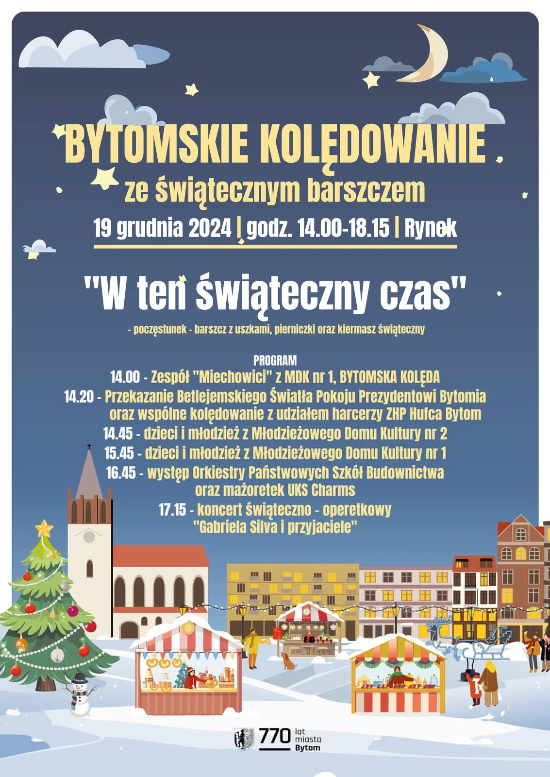 Trwają przygotowania do Bytomskiego Kolędowania ze Świątecznym Barszczem, które już w najbliższy czwartek, 19 grudnia, odbędzie na bytomskim Rynku. Na wszystkich czekać będą świąteczne rarytasy i wspólne kolędowanie. Plenerowa wigilia rozpocznie się o 14.00 i potrwa do 18.15.