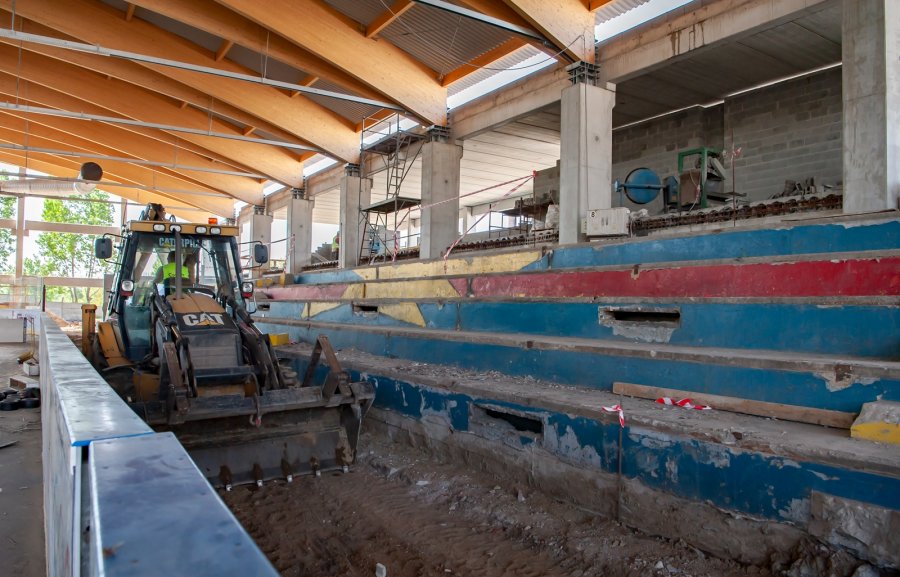 Wykonawca prowadzi również prace ciesielskie na wschodniej trybunie, gdzie przygotowywana jest konstrukcja – deskowanie – pod trybuny w nowej hali lodowiska. To właśnie tam po zakończeniu budowy trybun zostaną zainstalowane krzesełka w kolorze niebiesko-czerwonym. Warto dodać, że w czerwcu planowane jest rozpoczęcie robót związanych z budową układu drogowego po wschodniej stronie nowej hali lodowiska.