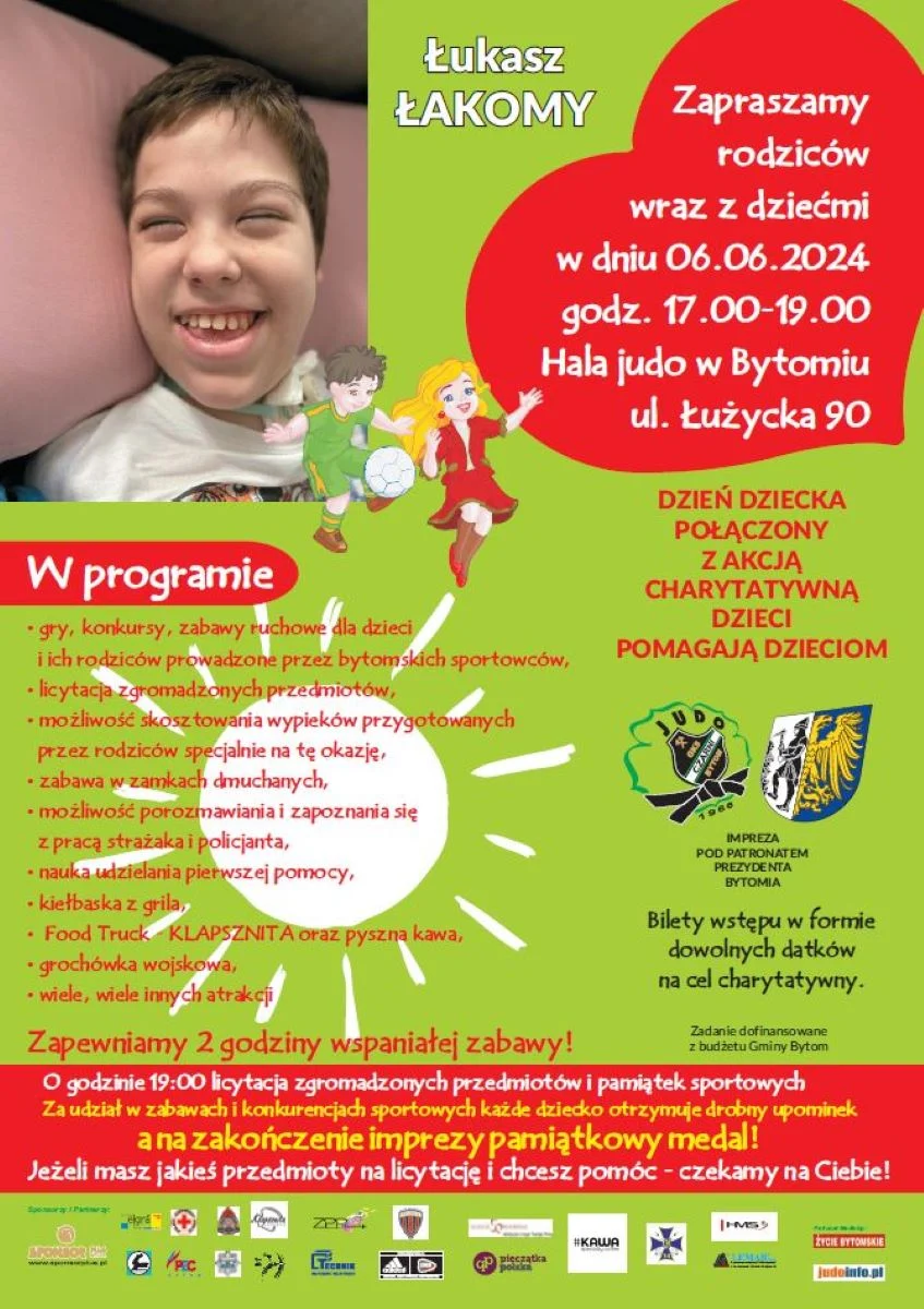 Jak co roku klub GKS Czarni Bytom organizuje z początkiem czerwca charytatywną akcję „Dzieci pomagają dzieciom”, podczas której prowadzona jest zbiórka pieniędzy na leczenie chorych dzieci. Tym razem podczas akcji, którą odbędzie się 6 czerwca od 17:00 do 19:00 dżudocy i dżudoczki będą zbierać pieniądze na pomoc dla 13-letniego Łukasza Łakomego, który urodził się z czterokończynowym dziecięcym porażeniem mózgowym i dystonią uogólnioną oraz całkowitym brakiem jelita cienkiego.