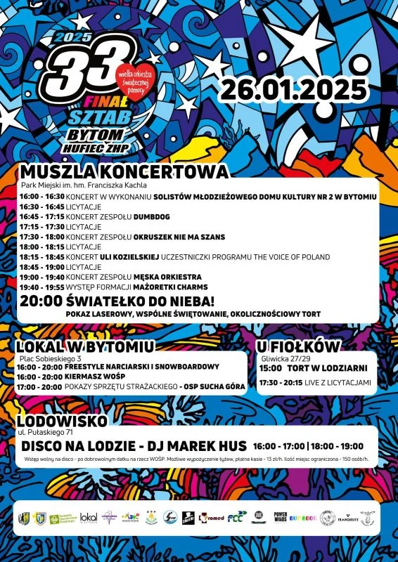 Impreza w Parku Miejskim rozpocznie się o 16.00, a w programie nie zabraknie pokazów umiejętności Centralnej Stacji Ratownictwa Górniczego i występów młodych wokalistów z MDK nr 2. Jak przystało na finał, będzie się działo na plenerowej scenie. Wystąpią: Okruszek nie ma szans, Orkiestra Męska, Ula Kozielska, a także bytomskie mażoretki. Imprezie towarzyszyć będą licytacje, a o 20.00 z Parku Miejskiego wysłane zostanie tradycyjne światełko do nieba.