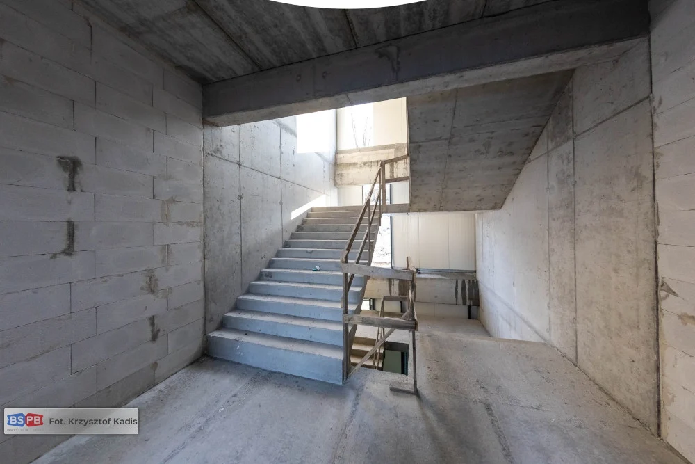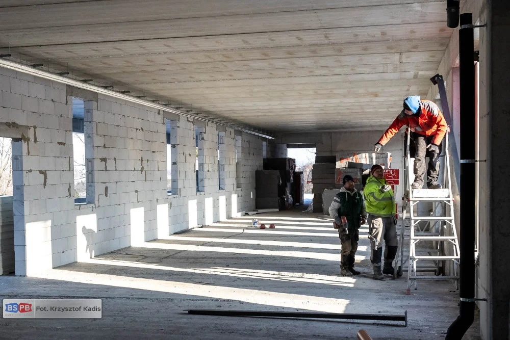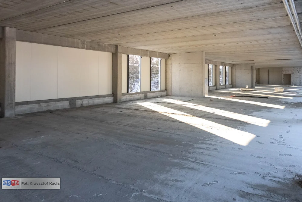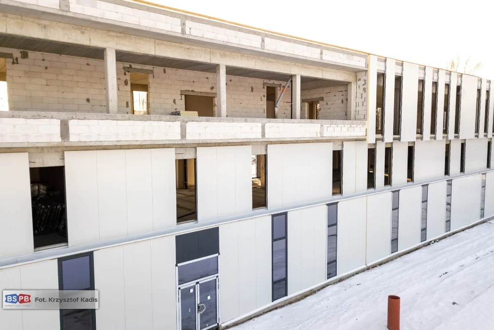 Zabudowane zostały okna i drzwi zewnętrzne, dzięki czemu zamknięta została prawie cała przestrzeń kondygnacji parteru. W lutym jest kontynuowany także montaż okien na kondygnacjach I i II piętra, a na parterze prowadzone są prace związane z izolacją posadzek, montażem kanałów wentylacyjnych oraz układaniem tras dla okablowania budynku.