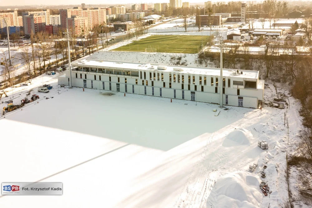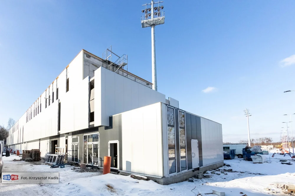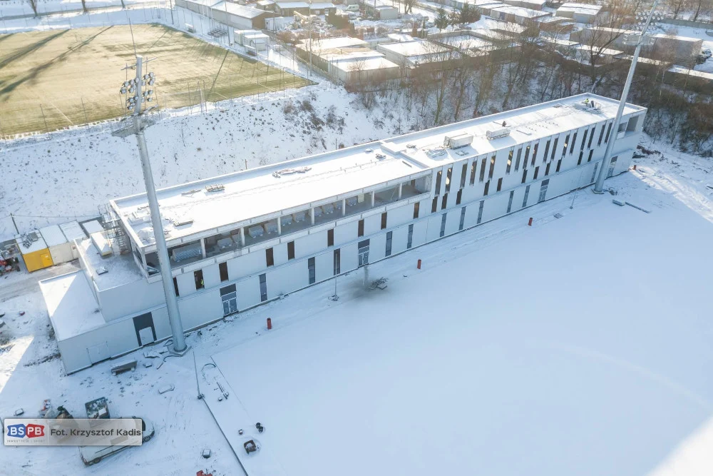Przy ul. Piłkarskiej trwają prace przy budowie nowego boiska wraz z zapleczem treningowym. Wykonawca inwestycji – firma Tamex Obiekty Sportowe SA finalizuje montaż paneli elewacyjnych oraz prace wewnątrz budynku.