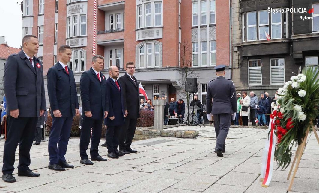 Tam rozpoczęła się część oficjalna obchodów Święta Niepodległości. Wśród oficjalnych delegacji kwiaty złożył również Zastępca Komendanta Miejskiego Policji w Bytomiu młodszy inspektor Damian Radziejowski. Nad bezpieczeństwem podczas trwania uroczystości czuwali bytomscy stróże prawa. Policjanci nie odnotowali żadnych incydentów.