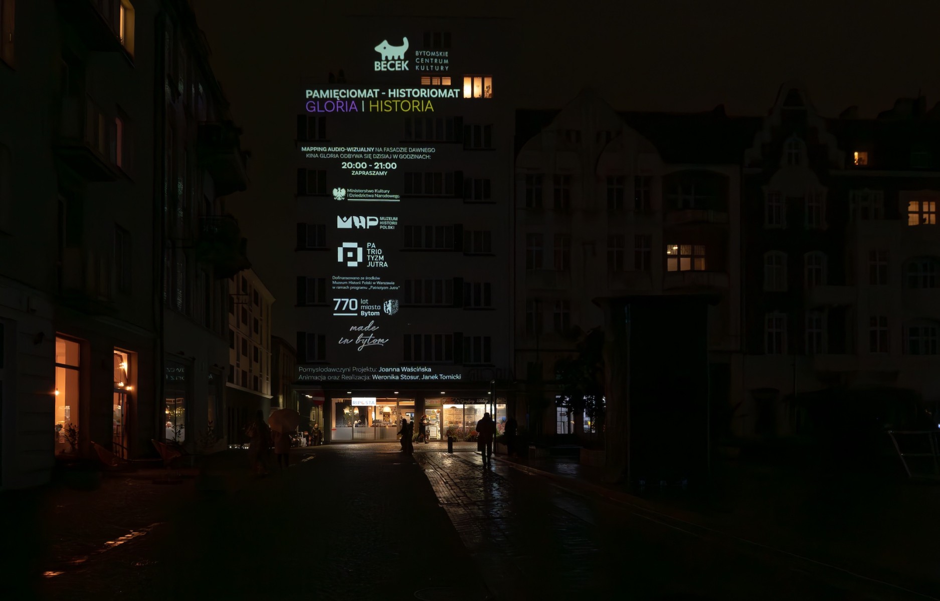 To było wyjątkowe wydarzenia dla miłośników bytomskiej architektury i dziejów kina w naszym mieście. Historyczny, bo pochodzący z 1931 roku budynek dawnego kina „Gloria” rozjaśnił mapping przedstawiający dzieje bytomskiej architektury i kin, które dawniej działały w naszym mieście. Ekspozycja na kinie „Gloria” zakończyła trwający ponad miesiąc projekt „Pamięciomat-Historiomat” realizowany przez Bytomskie Centrum Kultury.