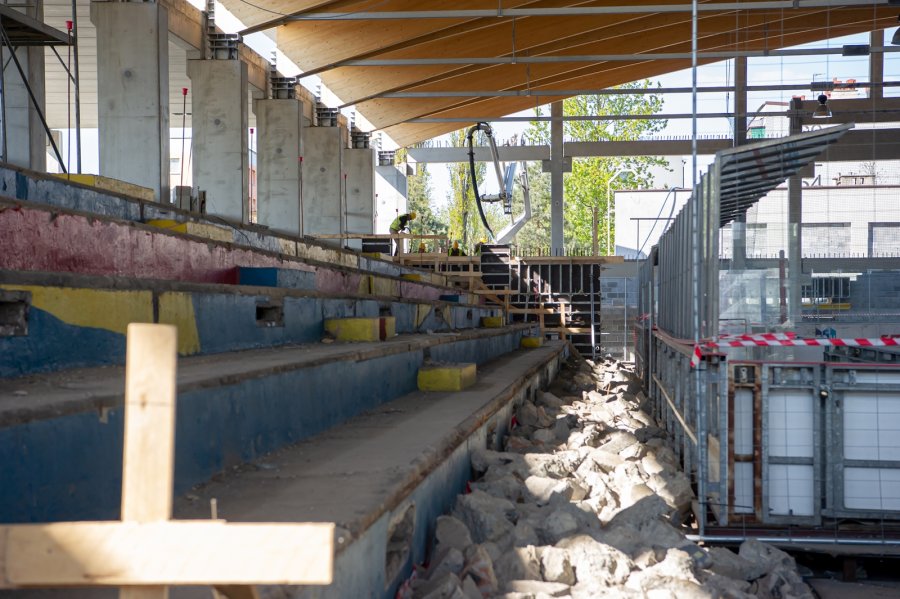 Wykonawca przystąpił również do prac ciesielskich, w ramach których przygotowana jest konstrukcja – deskowanie – pod trybuny w nowej hali lodowiska. To właśnie tam po zakończeniu budowy trybun zostaną zainstalowane krzesełka w kolorze niebiesko-czerwonym.
