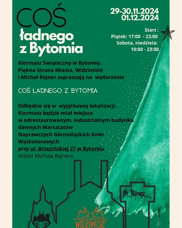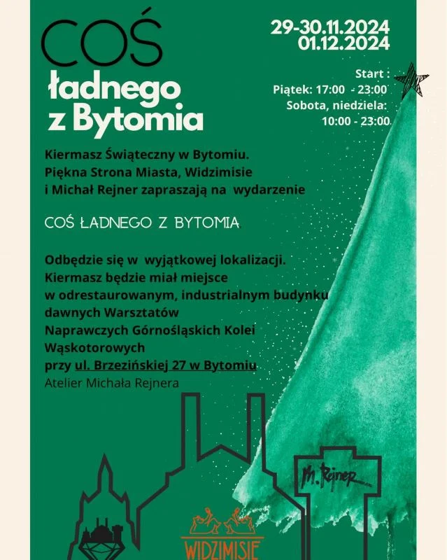 Zanim na bytomskim Rynku rozpocznie się Jarmark Świąteczny, w świąteczną atmosferę wprowadzą nas Stowarzyszenie Piękna Strona Miasta, właściciele lokalu Widzimisie oraz bytomski artysta Michał Rejner. To właśnie w jego pracowni w dawnej lokomotywowni Warsztatów Naprawczych Górnośląskich Kolei Wąskotorowych odbędzie się niezwykły jarmark, w których nie zabranie lokalnych wystawców, manufaktury oraz rękodzieła i dobrej gastronomii. Zapraszamy do Atelier pod suwnicą Michała Rejnera przy ul. Brzezińskiej 27 od 29 listopada do 1 grudnia.