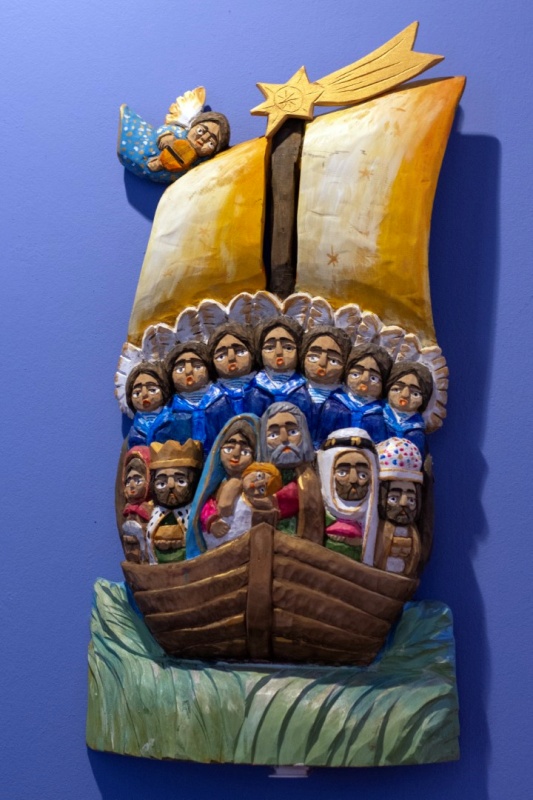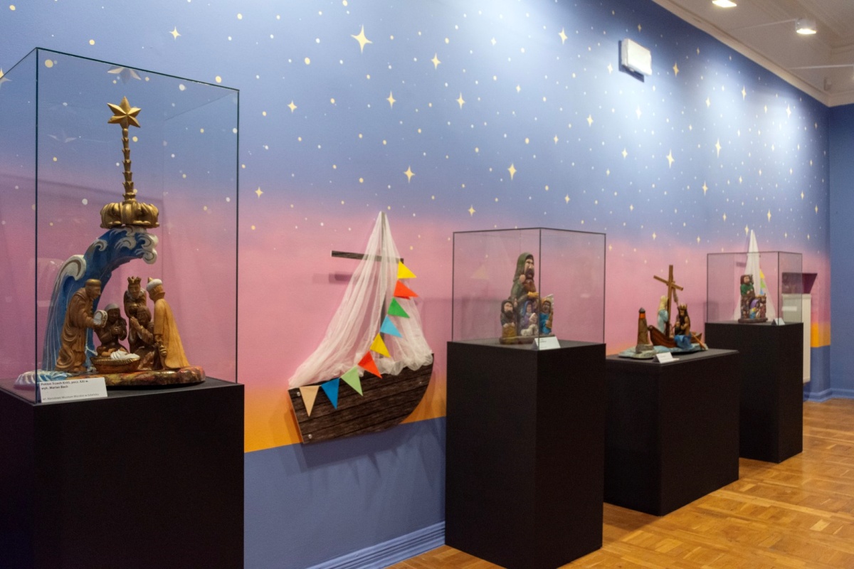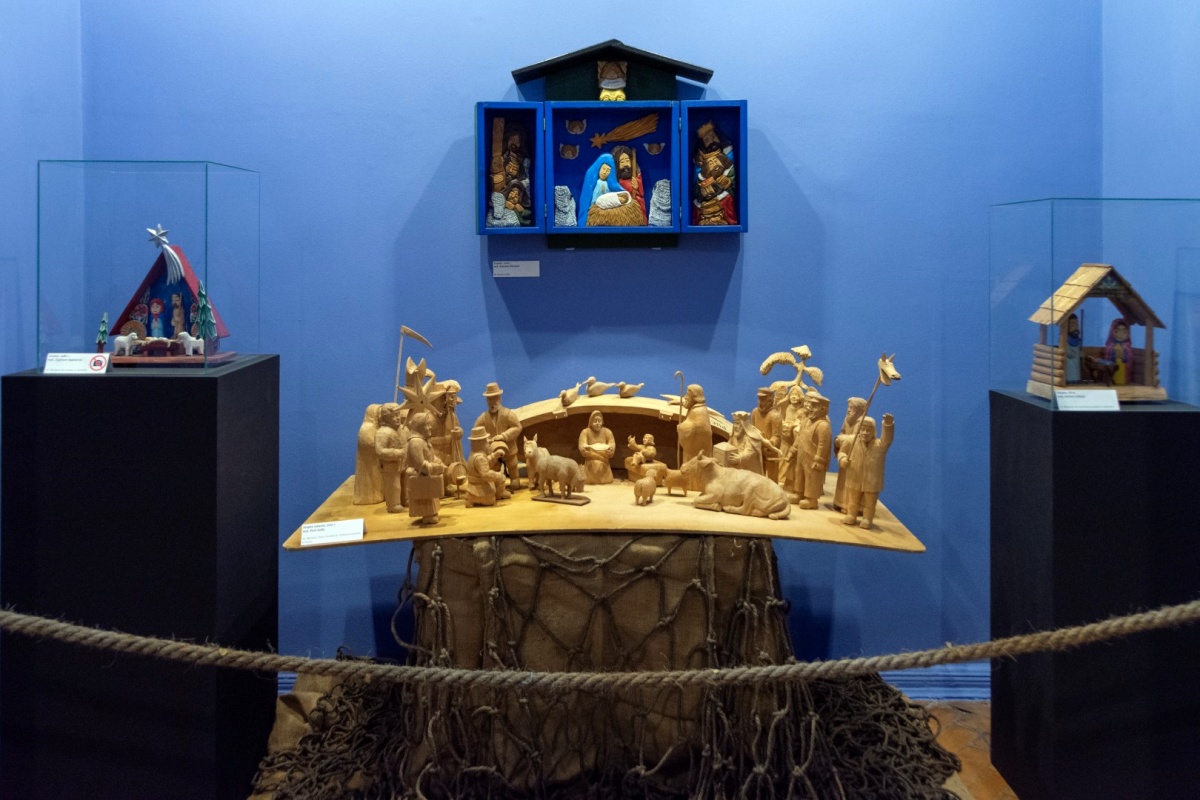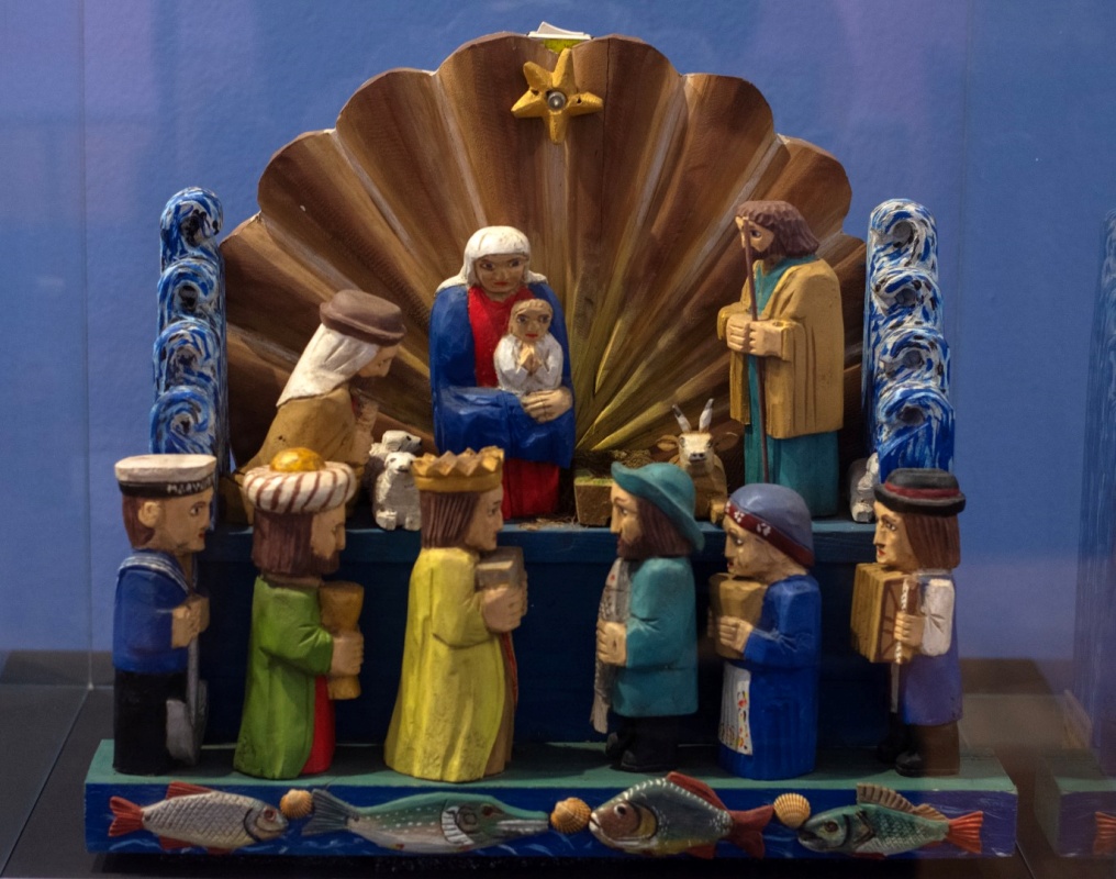 – Mamy Świętą Rodzinę płynącą łodzią, jak i łódź przewróconą symbolizującą stajenkę. Wśród darów składanych Dzieciątku są w przeważającej ilości ryby. Jednym z najciekawszych obiektów jest „Pokłon Trzech Króli” zaaranżowany pod kopułą z morskiej fali, nad którą widnieje złota gwiazda. Wygląda to trochę tak, jakby pokłon składało również samo morze. Na wystawie są także szopki w formie karuzeli i pozytywki – mówi dr Daria Misiak.