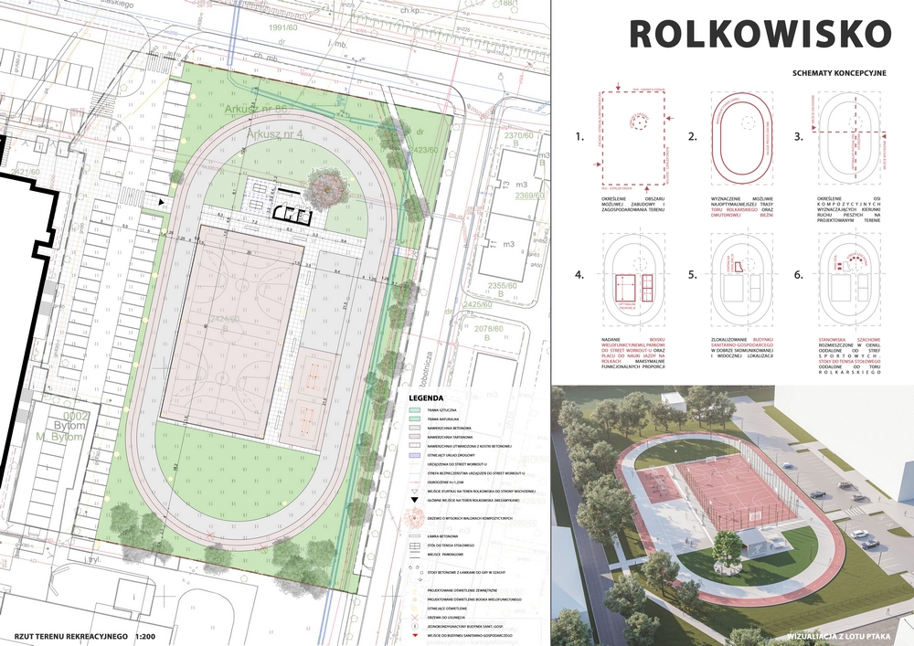 W ramach realizowanej inwestycji powstanie obok rolkowiska o szerokości minimum 4 m, również boisko wielofunkcyjne o nawierzchni tartanowej o wymiarach 40 na 20 m, park do street workoutu, bieżnia dwutorowa oraz stoły do ping-ponga i gry w szachy. Teren, na którym realizowana będzie inwestycja zostanie ogrodzony, oświetlony oraz wyposażony w piłkochwyty i ławki, a na obiekcie powstanie również zaplecze sanitarno – gospodarcze.
