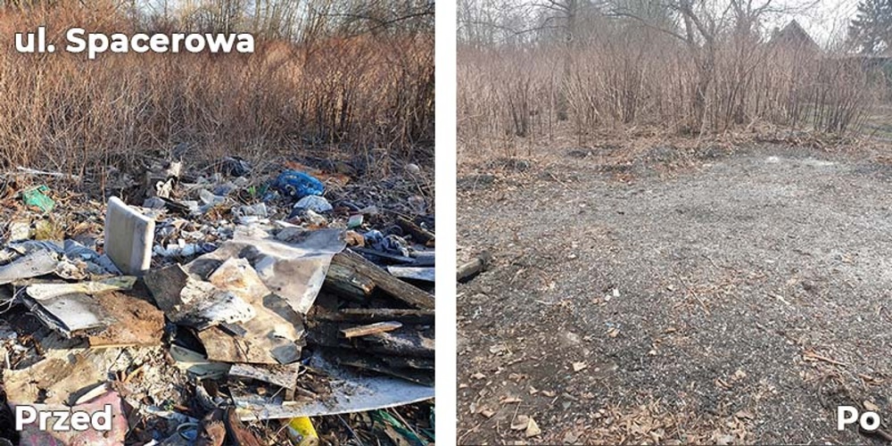 Pracownicy MZDiM posprzątali również tereny przy ulicy Spacerowej oraz ul. Katowickiej 44-46. W trakcie prac przy ulicy Spacerowej usunięto 7,5 m3 odpadów wielkogabarytowych, 3 m3 odpadów komunalnych, 1,5 m3 sprzętu AGD oraz 117 opon. Przy ul. Katowickiej 44-46 usunięto 150 m3 odpadów, w tym gruz, zanieczyszczenia komunalne oraz belki stropowe.