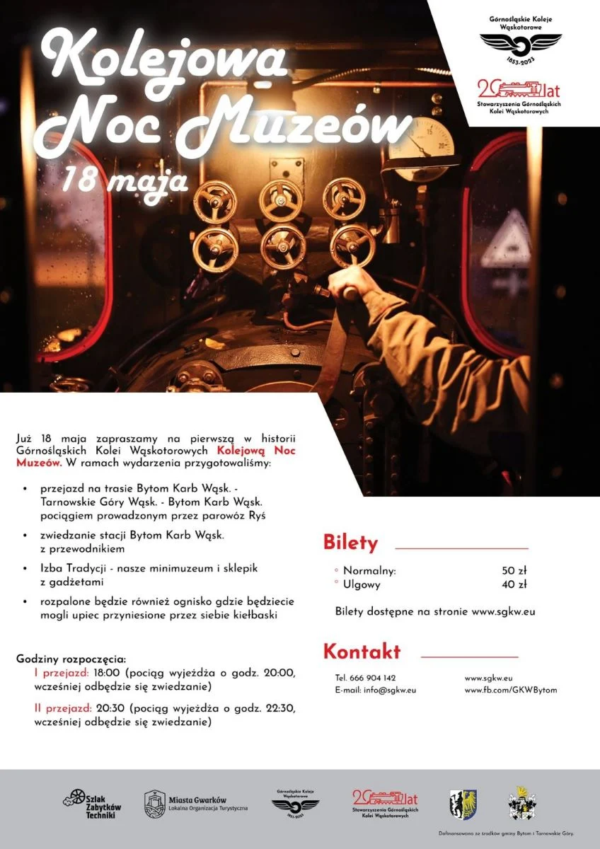 Największą atrakcją Kolejowej Nocy Muzeów będą wieczorne przejazdy popularnym „Rysiem”, który Stowarzyszenie Górnośląskich Kolei Wąskotorowych dzięki pomocy Miasta Bytom pozyskało w grudniu 2021 roku. 18 maja zaplanowano dwa przejazdy: o godz. 18:00 (pociąg wyjeżdża o godz. 20:00, wcześniej odbędzie się zwiedzanie) i 20:30 (pociąg wyjeżdża o godz. 22:30, wcześniej odbędzie się zwiedzanie) na trasie Bytom Karb Wąskotorowy – Tarnowskie Góry Wąskotorowe – Bytom Karb Wąskotorowy. Sprzedaż biletów na ten wyjątkowy przejazd rozpoczęła się już wczoraj.