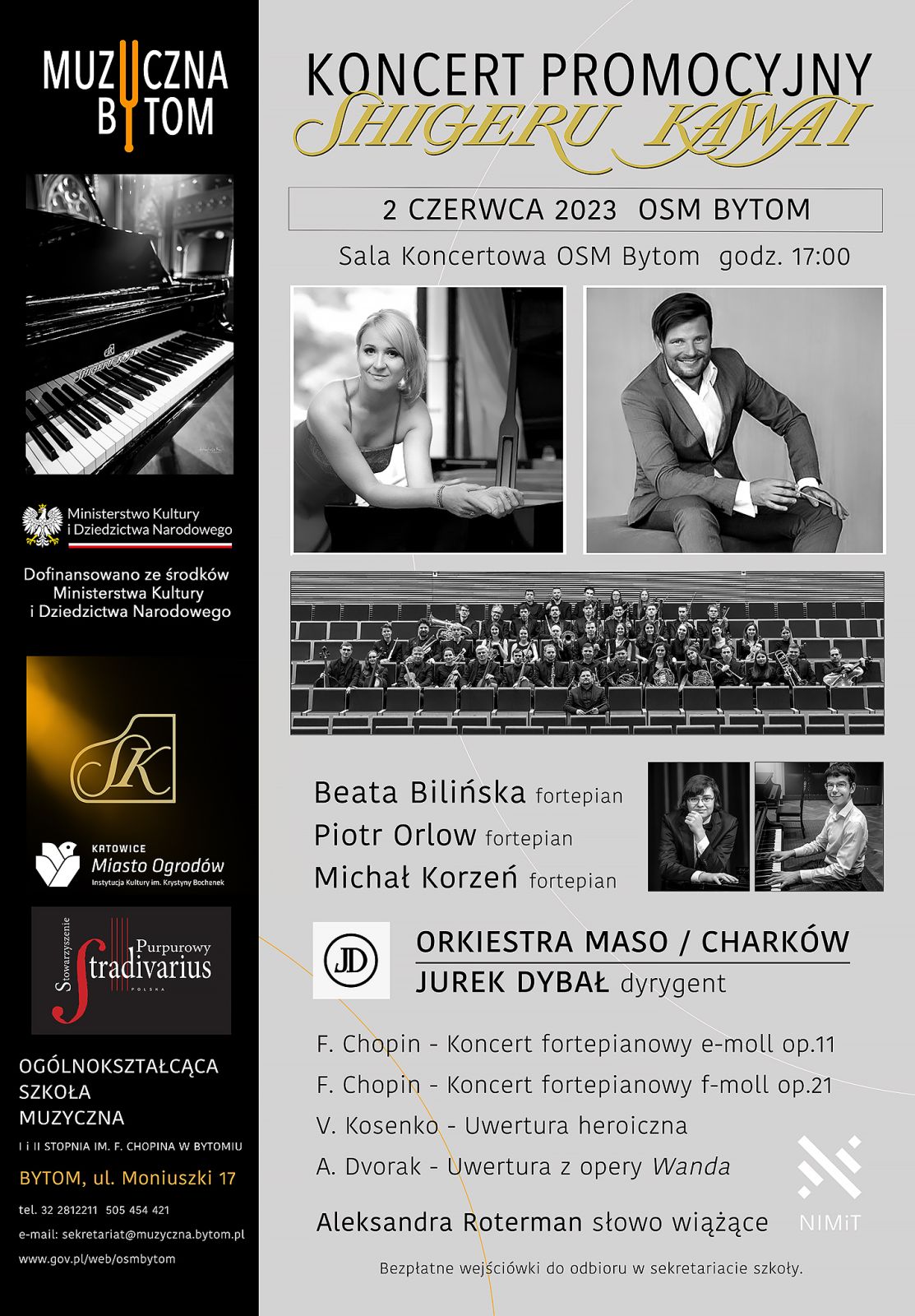 Na scenie sali koncertowej bytomskiej szkoły muzycznej odbędzie się 2 czerwca o 17:00 niezwykły koncert, podczas którego wystąpią Beata Bilińska i jej wychowankowie – Piotr Orlow i Michał Korzeń, a towarzyszyć im będzie uznawana za jedną z najlepszych młodzieżowych orkiestr symfonicznych w Europie, Orkiestra MASO, czyli Młodzieżowa Akademicka Orkiestra Symfoniczna Ukrainy „Słobożański” z Charkowa pod batutą Jurka Dybała. Będzie to koncert związany z promocją nowego, koncertowego fortepianu marki SHIGERU KAWAI, pozyskanego dla szkoły ze środków Ministerstwa Kultury i Dziedzictwa Narodowego w 2022 roku.