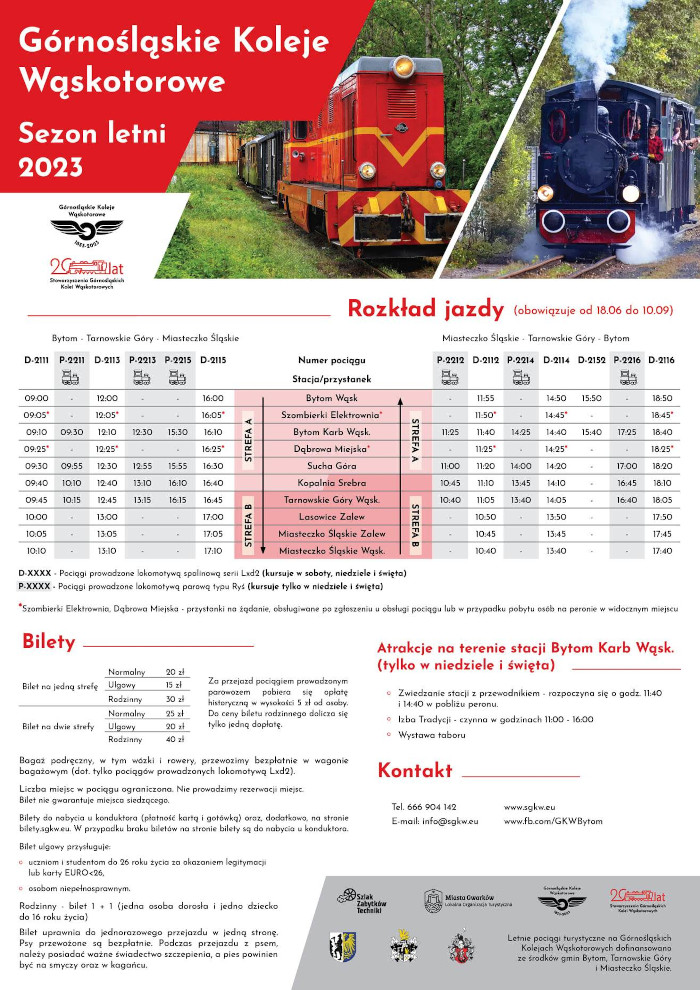 Pociągami prowadzonymi lokomotywą spalinową na trasie Bytom – Tarnowskie Góry – Miasteczko Śląskie pojedziemy w soboty, niedziele i święta. Z kolei w niedziele i święta będzie okazja przejechać się parowozem na odcinku Bytom Karb Wąskotorowy -Tarnowskie Góry. Do tego, co niedzielę na terenie stacji Bytom Karb Wąskotorowy o 11.40 i 14.40 na chętnych czekać będą przewodnicy gotowi oprowadzić i opowiedzieć o historii wąskiej kolei.