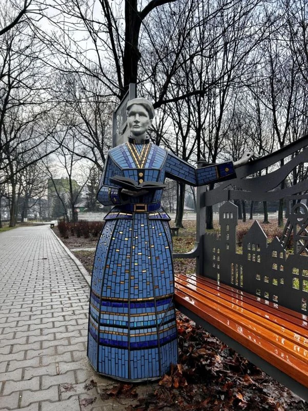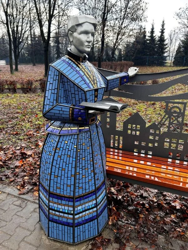 Postać stojącej z książką Joanny Gryzik- Schaffgotsch, została obłożona mozaiką ceramiczną w taki sposób, żeby zaakcentować charakter tkaniny oraz ulubione kolory postaci – niebieski i złoty. Twarz i dłonie zostały wykonane ze stali nierdzewnej. Koszt inwestycji to ponad 71 tys. zł.