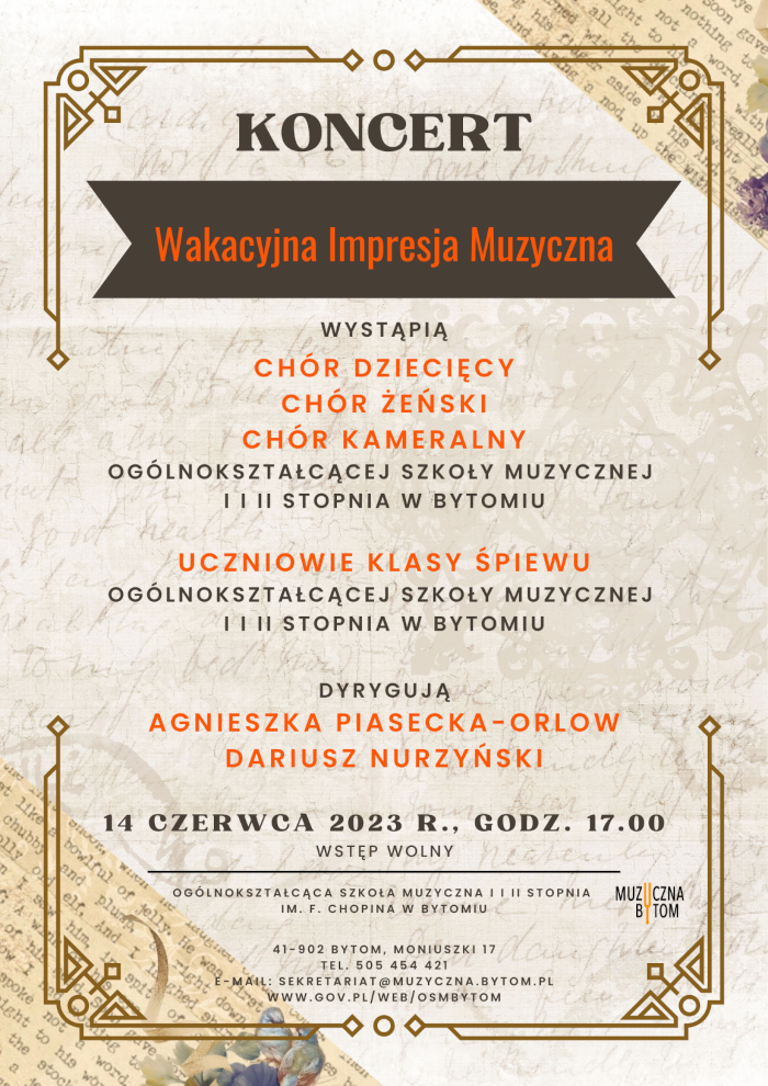 W środę, 14 czerwca o 17.00 wystąpią: Chór Dziecięcy i Chór Żeński pod dyrekcją Agnieszki Piaseckiej-Orlow, Chór Kameralny pod dyrekcją Dariusza Nurzyńskiego oraz uczniowie klasy śpiewu Agnieszki Bochenek-Osieckiej i Aleksandry Poniszowskiej.