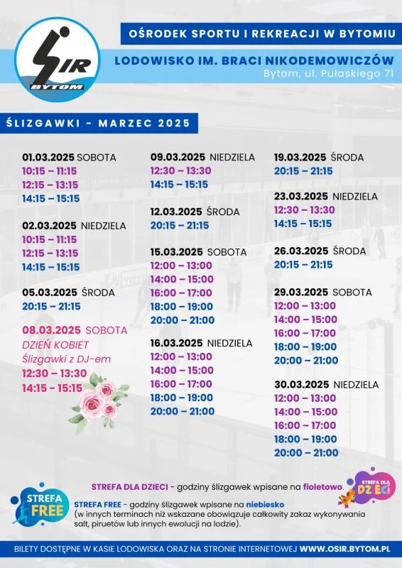 Ośrodek Sportu i Rekreacji w Bytomiu opublikował harmonogram ślizgawek na marzec 2025. Miłośnicy jazdy na łyżwach mogą już zaplanować swoją wizytę na Lodowisku im. Braci Nikodemowiczów. Sprawdź szczegóły i skorzystaj z wyjątkowych okazji!