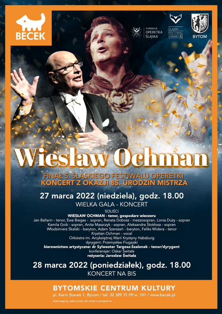 Urodzin Maestro Wiesława Ochmana oraz KONCERT NA BIS w dniu 28 marca o godz. 18:00. Koncerty odbędą się z udziałem Mistrza – gospodarza uroczystości, w Bytomskim Centrum Kultury.