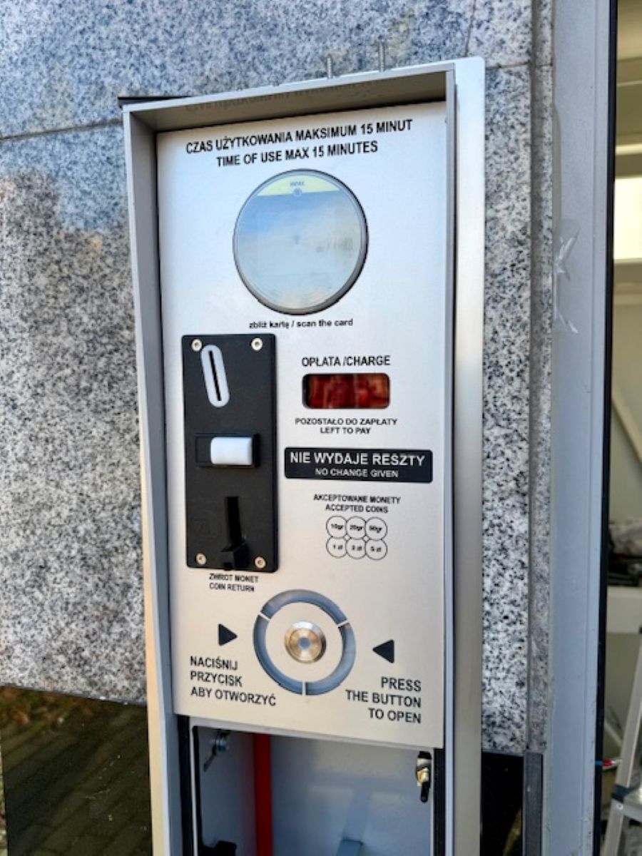 Z miejskiego szaletu nadal będzie można skorzystać, wrzucając 2 zł do wrzutomatu. Pierwsze terminale są już zamontowane, jednak na możliwość płatności kartą musimy jeszcze poczekać, ponieważ trwają prace związane konfiguracją zainstalowanych terminali z systemem otwierania drzwi oraz prace związane z zawarciem umów o płatności bezgotówkowe.