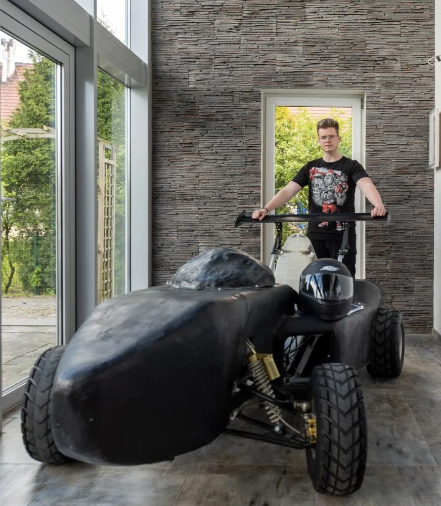 Najpierw była dziecięca fascynacja samochodami, potem proste instalacje wykonywane pod okiem dziadka i wreszcie marzenia o swoich własnych konstrukcjach. Z ich realizacją nie czekał zbyt długo. Na swoim koncie ma już elektrycznego gokarta i spalinowego buggy (połączenie terenówki i quada). Pracę nad bolidem rozpoczął w drugiej klasie.