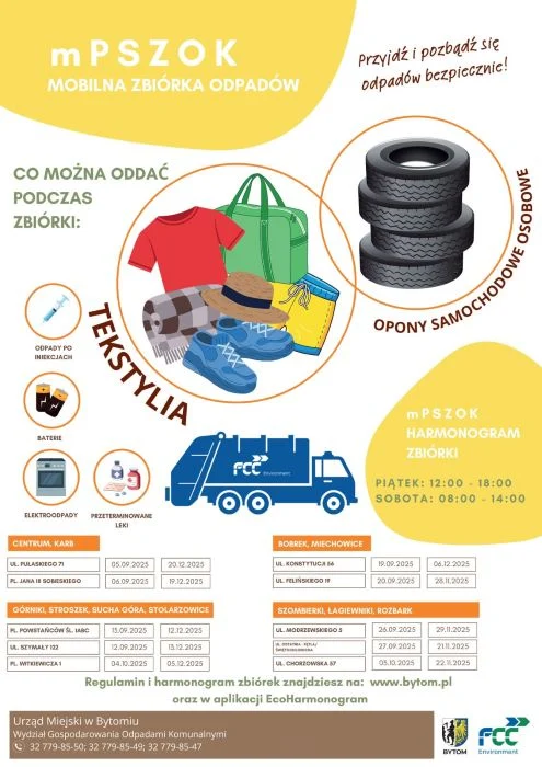 Od września wracają regularne zbiórki odpadów w dzielnicach w ramach mobilnego Punktu Selektywnej Zbiórki Odpadów Komunalnych (mPSZOK). Mieszkanki i mieszkańcy Bytomia będą mogli bezpłatnie oddawać m.in. tekstylia, opony czy elektroodpady.