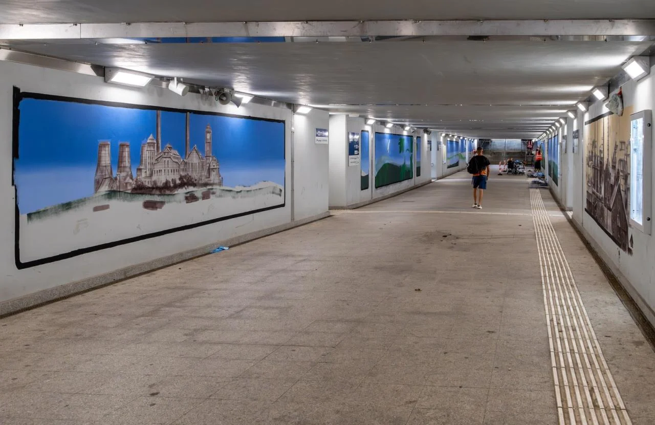 Na ścianach bytomskiego tunelu odnajdziemy – przywołujące na myśl widoki z okna pociągu – dobrze nam znane obiekty: wąskotorówkę, monumentalną EC Szombierki, dawną Hutę Julię, secesyjny gmach IV LO czybudynek Muzeum Górnośląskiego.