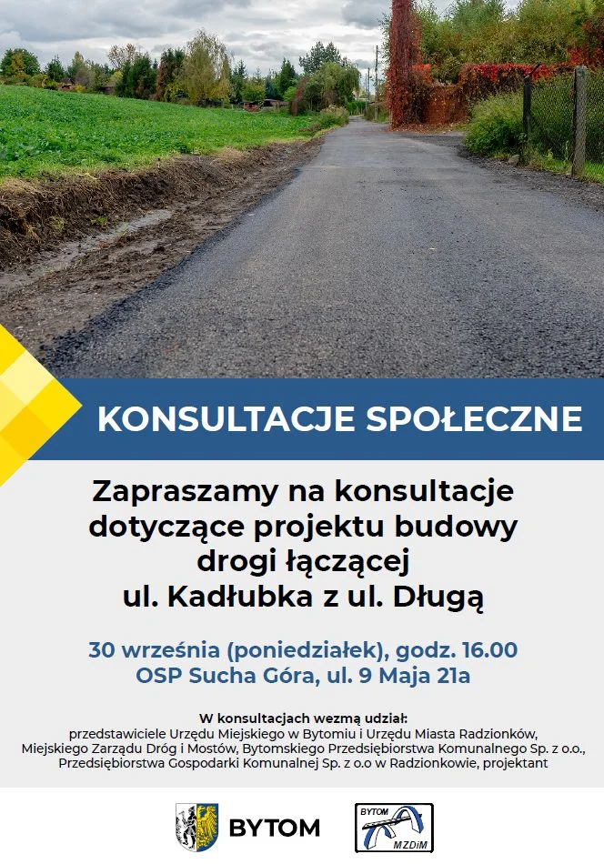 Miejski Zarząd Dróg i Mostów w Bytomiu zlecił już projekt budowy drogi. O projekcie i planowanej inwestycji z mieszkańcami ul. Kadłubka będą rozmawiać 30 września w OSP Sucha Góra przy ul. 9 Maja 21a przedstawiciele władz miasta, MZDiM-u oraz projektanta, a także Urzędu Miejskiego w Radzionkowie, Bytomskiego Przedsiębiorstwa Komunalnego i Przedsiębiorstwa Gospodarki Komunalnej w Radzionkowie. Zapraszamy na konsultacje społeczne o godz. 16.00.