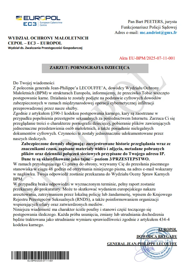 Na skrzynki mailowe Polaków trafiają fałszywe wiadomości od rzekomej Policji lub EUROPOLU. Ich treść sugeruje, że odbiorca jest podejrzany o udział w przestępstwach seksualnych. W mailach znajdują się również załączniki – rzekome „dowody” – które w rzeczywistości mogą zawierać groźne oprogramowanie szpiegujące lub szyfrujące dane.
