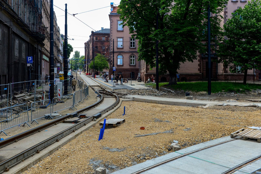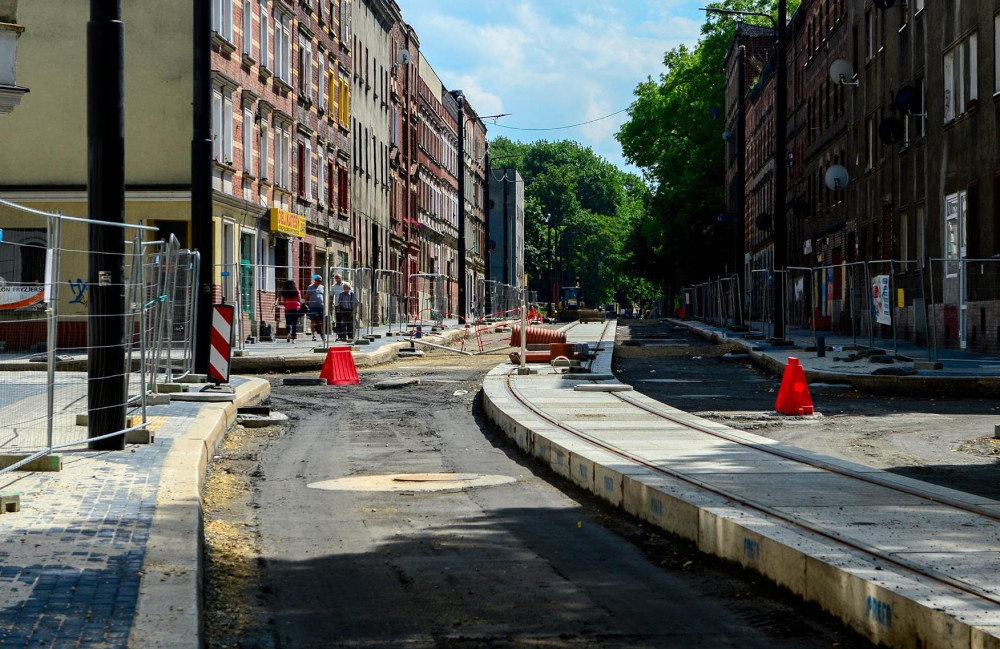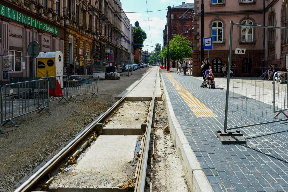 Nowe torowisko tramwajowe, chodniki, budowa peronów. Trwa przebudowa ul. Piekarskiej