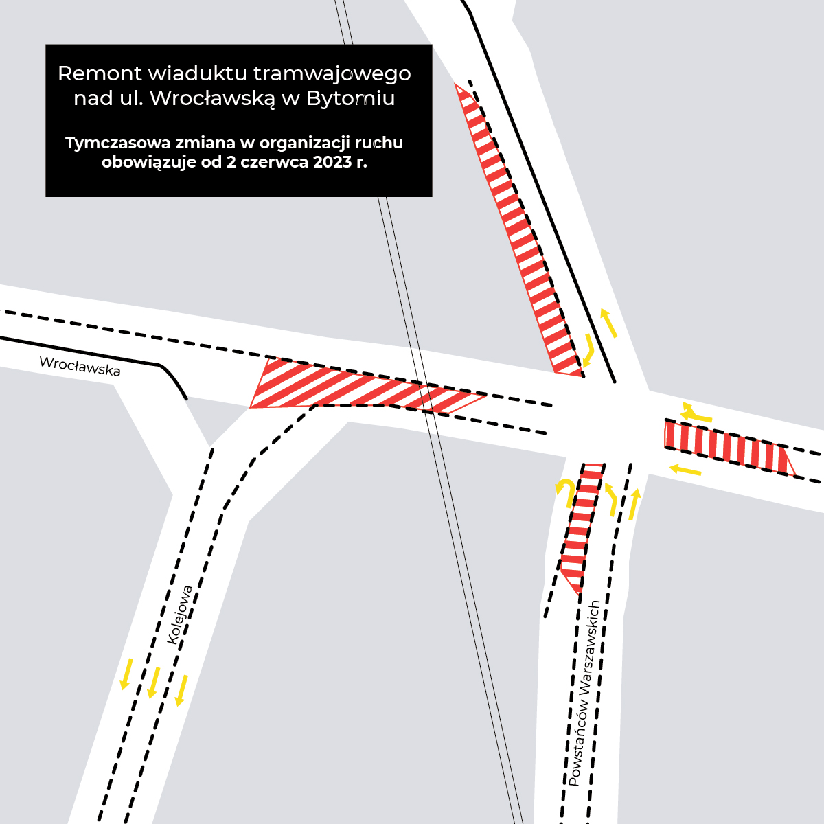 Remont wiaduktu będzie się wiązał z koniecznością zmiany organizacji ruchu w rejonie skrzyżowań ulic Wrocławskiej i Kolejowej oraz Powstańców Warszawskich, Strzelców Bytomskich i Wrocławskiej: