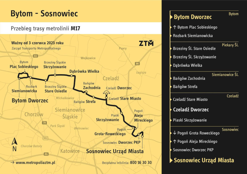 Linia metropolitalna M17 łączy Bytom z Czeladzią i Sosnowcem. Linia rozpoczyna kurs z dworca autobusowego na pl. Wolskiego i zatrzymuje się na 12 przystankach: