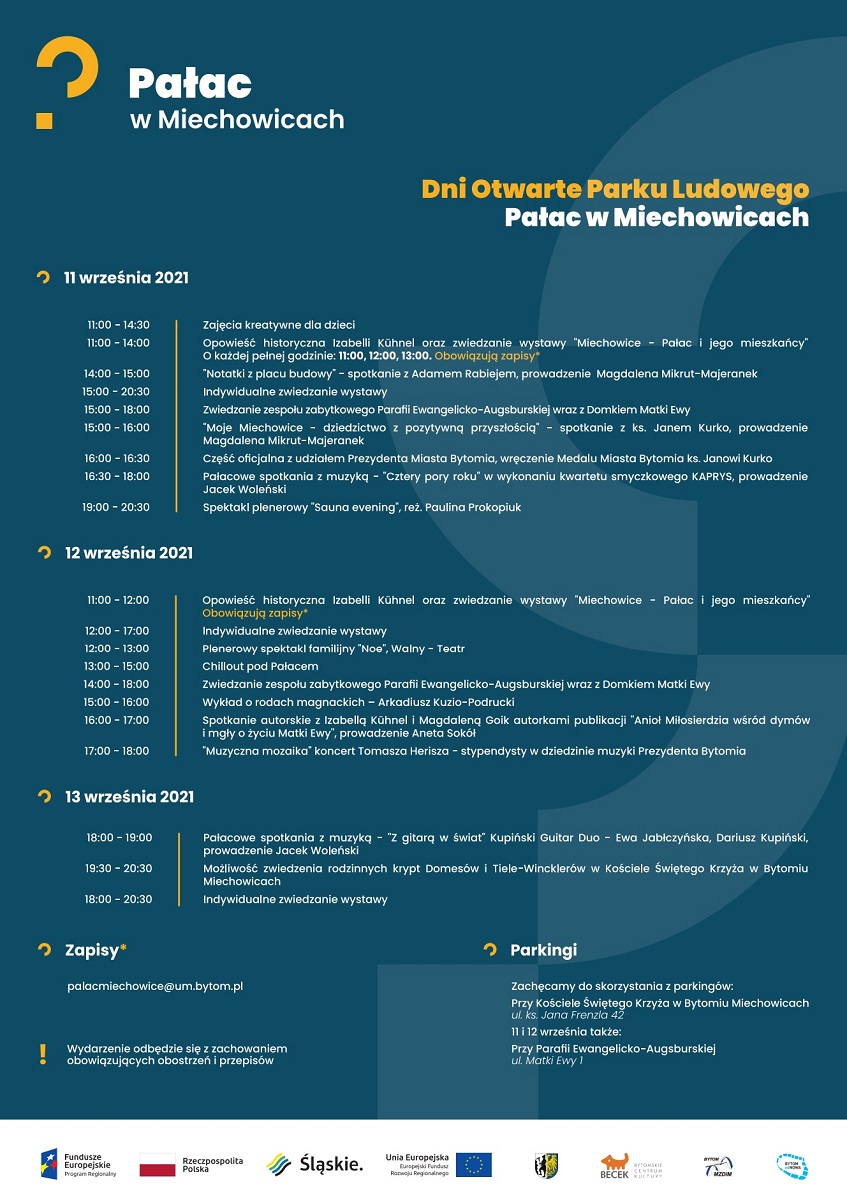 Pałacowi i jego mieszkańcom poświęcona będzie opowieść historyczna i wystawa „Miechowice – Pałac i jego mieszkańcy”, której kuratorką jest Izabella K�źhnel, archeolożka, od wielu lat związana z Muzeum Górnośląskim, autorka publikacji i albumów m.in. o wielokulturowości dziejów naszego regionu. Dni Otwarte rozpoczną się w sobotę, 11 września o 11.00, a w ramach wydarzenia odbędą się m.in. warsztaty dla dzieci, zwiedzanie pałacu i sąsiadującej z nim parafii ewangelicko-augsburskiej, a także wystawa, spektakl i koncert. W ramach pałacowych spotkań z muzyką o godz. 17.00 wystąpi kwartet smyczkowy Kaprys, natomiast dzień zakończy spektakl plenerowy „Sauna evening” w reżyserii Pauliny Prokopiuk.