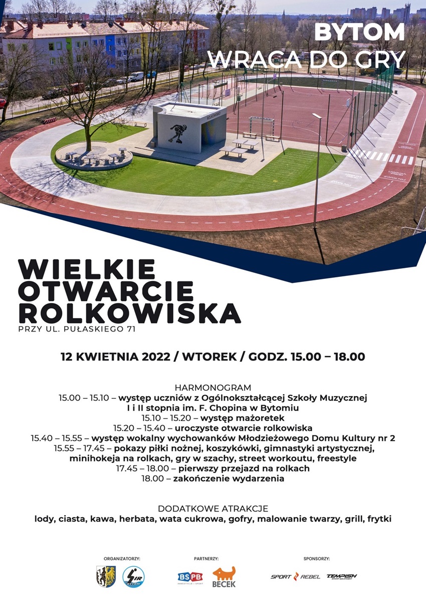 Podczas dnia otwartego rolkowiska w godz. od 15.00 do 18.00 będzie można skorzystać z obiektu, podziwiać występy artystyczne mażoretek oraz uczniów Ogólnokształcącej Szkoły Muzycznej I i II stopnia im. F. Chopina w Bytomiu i Młodzieżowego Domu Kultury nr 2. Będzie można też wziąć udział w pokazach gimnastyki artystycznej, minihokeja na rolkach, gry w piłkę nożną, koszykówkę, szachy, street workoutu i freestyle.