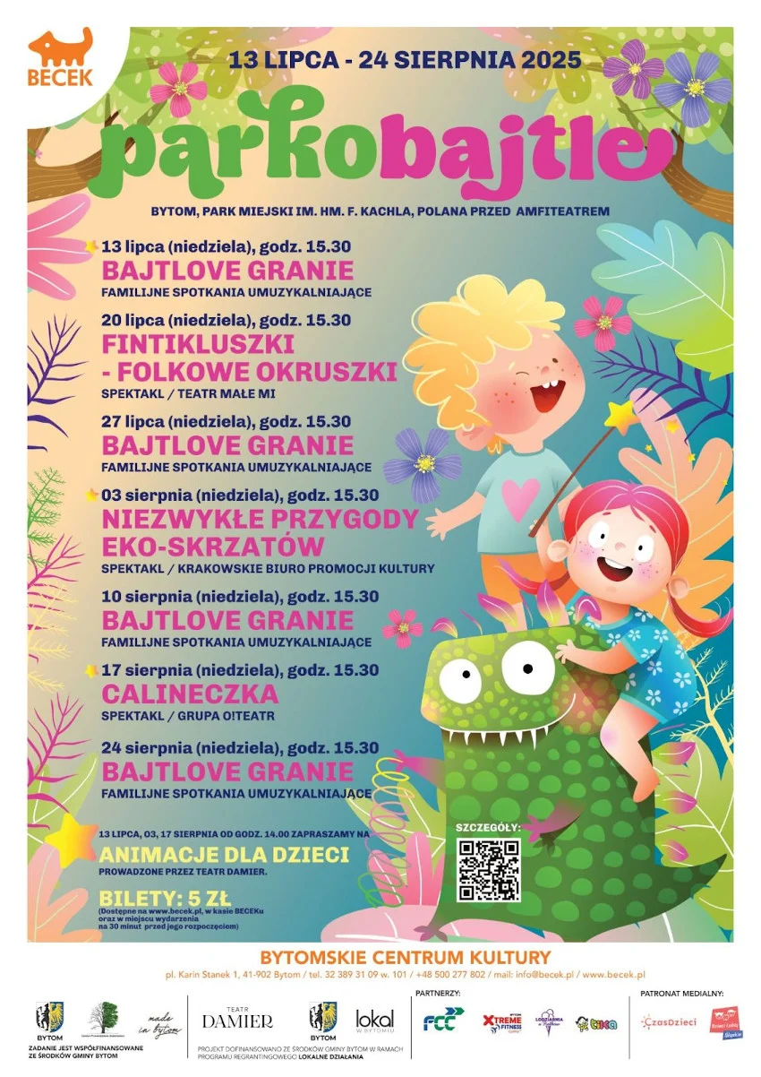 Program Parkobajtli skierowany jest przede wszystkim do najmłodszych. W niedzielne popołudnia dzieci wraz z opiekunami mogą wziąć udział w familijnych wydarzeniach łączących muzykę, teatr i wspólną zabawę. Pierwsze spotkanie – Bajtlove Granie – rozbrzmiało śmiechem i radością na scenie amfiteatru w Parku Miejskim im. F. Kachla.