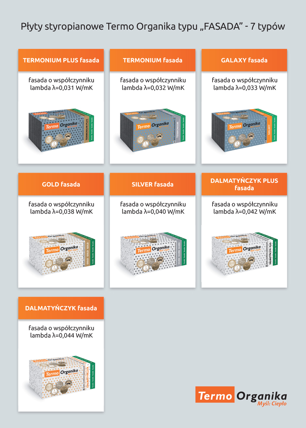 Podstawowym materiałem termoizolacyjnym i zarazem najważniejszym elementem składowym Kompletnego Systemu Ociepleń Termo Organika jest styropian. W ofercie są dostępne płyty styropianowe typu „FASADA” aż w 7 odmianach, które różnią się właściwościami izolacyjnymi i parametrami mechanicznymi, co przedstawia grafika.
