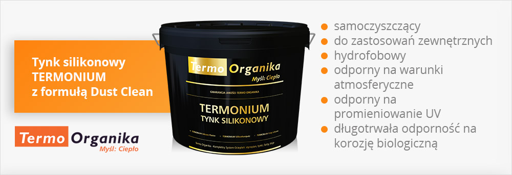 Najlepszym obecnie rozwiązaniem jest tynk silikonowy TERMONIUM, który posiada formułę DUST Clean, czyli zdolność samooczyszczenia, co sprawia, że brud trudniej się do niego przyczepia, bo jego powierzchnię zmywa deszcz. Takie tynki warto stosować w szczególności w miejscach o dużym natężeniu ruchu, bliskości drzew i wysokich krzewów oraz w sąsiedztwie zbiorników wodnych, gdziemoże być większa wilgotność powietrza. Tynk silikonowy dłużej zachowa swoje walory.