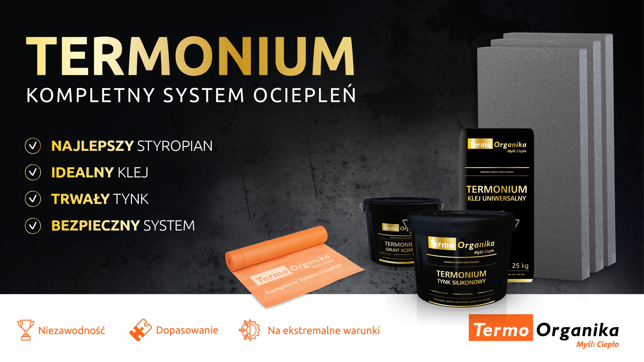 System TERMONIUM to najlepszy wariant Kompletnego Systemu Ociepleń Termo Organika, oparty na najcieplejszym grafitowym styropianie z linii TERMONIUM, mocowany za pomocą kleju uniwersalnego TERMONIUM, który również służy do wykonywania warstwy zbrojonej. Cały system wieńczy najbardziej zaawansowany technologicznie tynk silikonowy TERMONIUM  dostępny w szerokiej palecie barw Colors of Termo Organika.