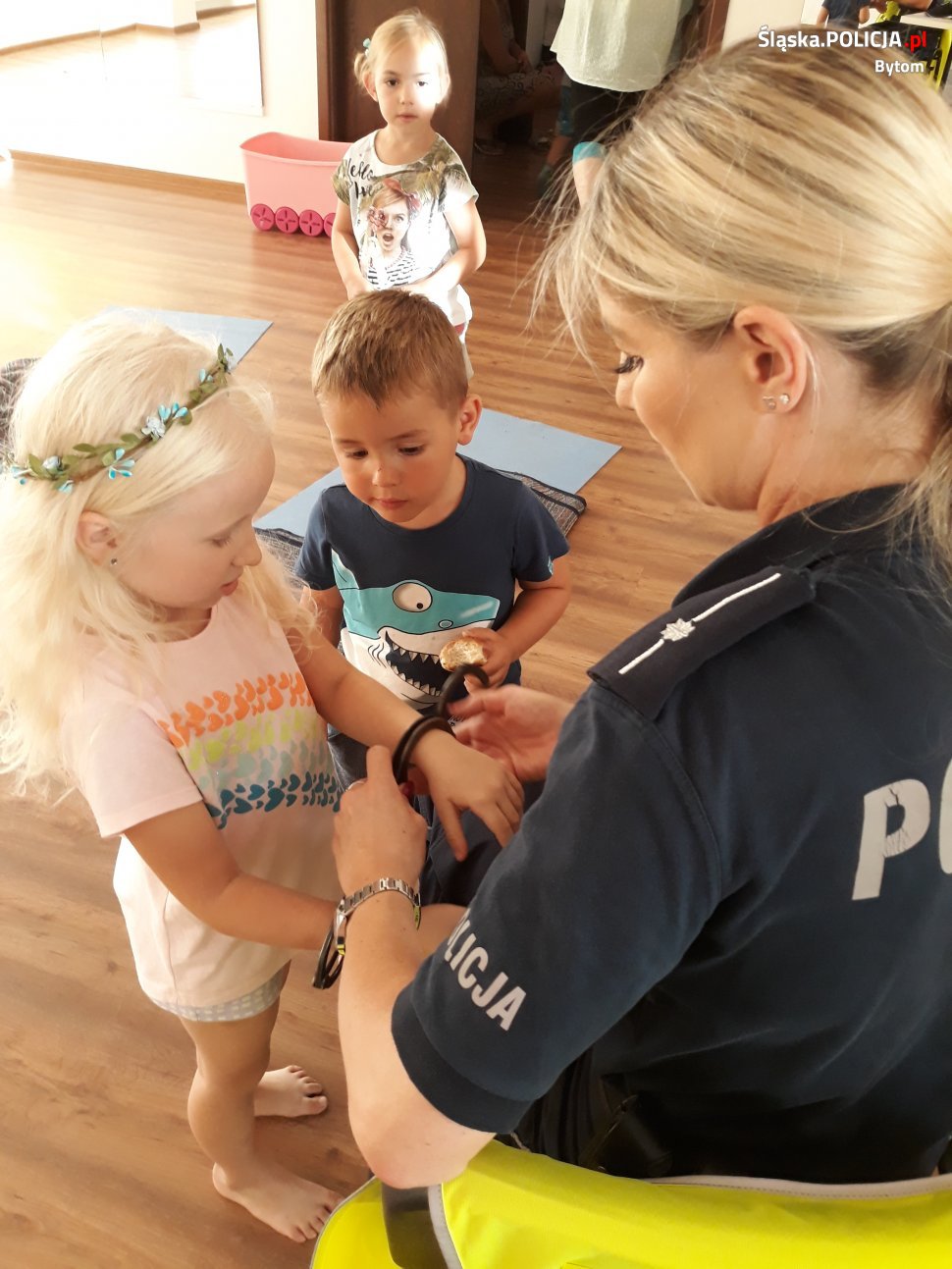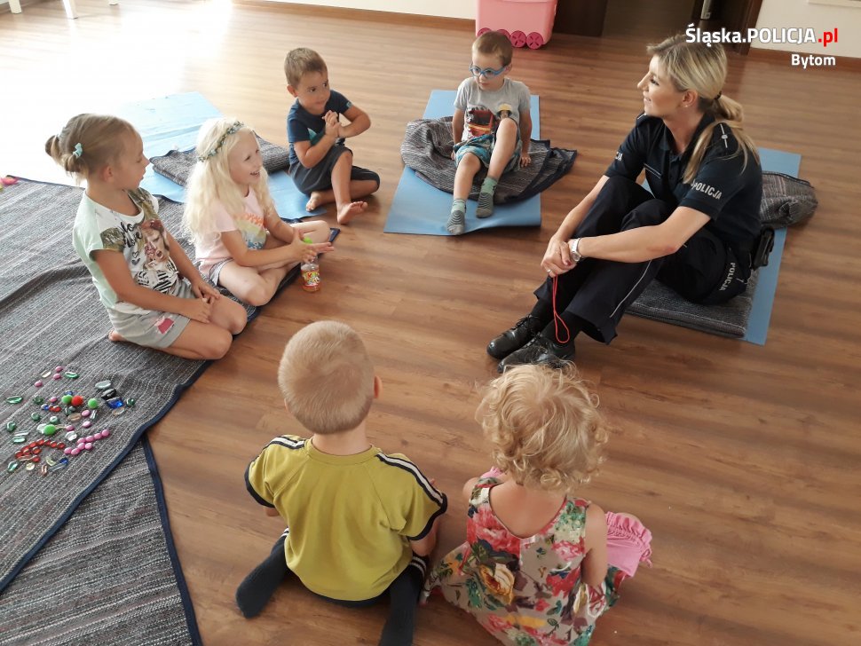 Bytomscy stróże prawa z Komendy Miejskiej Policji w Bytomiu gościli u dzieci biorących udział w półkoloniach organizowanych przez Akademię Aktywności Ruchowej w Bytomiu przy ulicy Moniuszki. W czasie spotkania mundurowi rozmawiali z dziećmi i przekazali informacje dotyczące ich bezpieczeństwa podczas zabaw na dworze oraz poruszania się po drodze. Mundurowi przypomnieli o konieczności noszenia odblasków na ubraniu lub na plecakach. W związku z okresem wakacyjnym poruszono także temat bezpiecznego wypoczynku nad wodą w lesie lub w górach. Na zakończenie spotkania najmłodsi pozowali do wspólnego zdjęcia z maskotką śląskiej policji, psem Sznupkiem. Stróże prawa zapowiadają kolejne tego typu spotkania w ramach ogólnopolskiej kampanii „Kręci mnie bezpieczeństwo”.