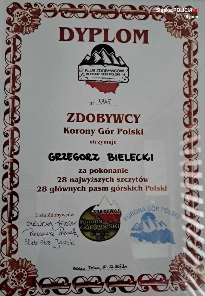 To jednak niejedyne jego osiągnięcia. W 2022 roku uzyskał tytuł „Zdobywcy Korony Gór Polski”. Odznaczenie to przyznawane jest osobom, które zdobędą 28 najwyższych szczytów wszystkich pasm górskich w Polsce. Udało mu się tego dokonać dzięki wytrwałości, odpowiedzialności i zamiłowania do gór. Od pięciu lat Grzegorz każdą wolną chwilę przeznacza na piesze wycieczki po górskich pod okiem doświadczonej przewodniczki tatrzańskiej i w towarzystwie swojego kolegi, również bytomskiego policjanta.
