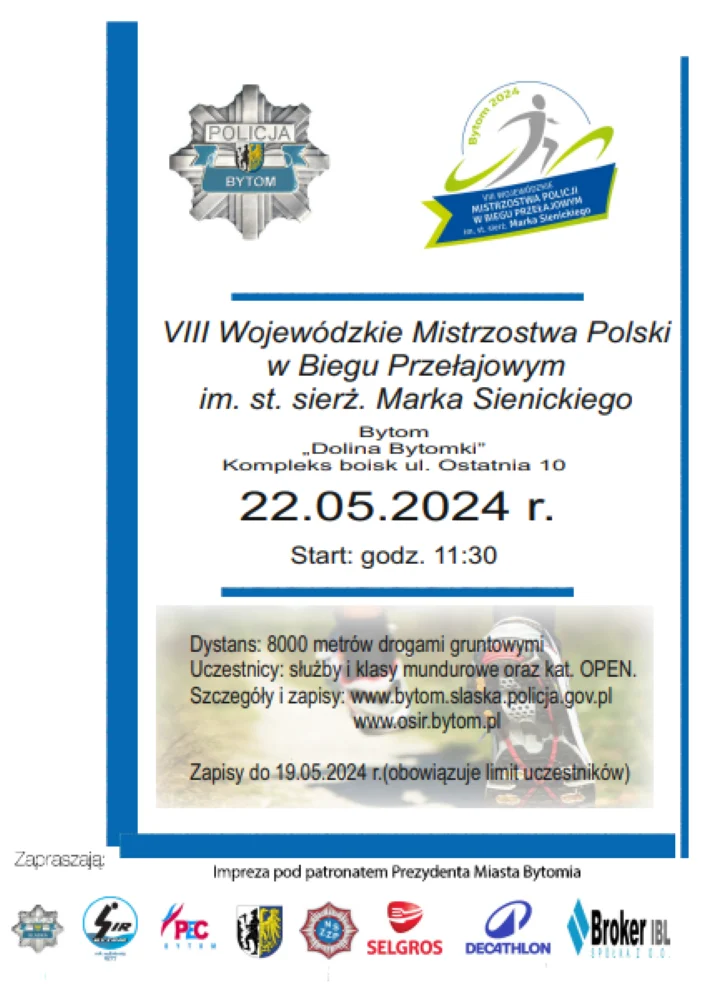 22 maja w Bytomiu rozpoczną się VIII Wojewódzkie Mistrzostwa Policji w Biegu Przełajowym imienia starszego sierżanta Marka Sienickiego. Do udziału w zawodach mogą się zgłaszać zarówno mundurowi, jak i cywile. Wszyscy miłośnicy biegania, którzy zgłoszą chęć udziału w mistrzostwach, są zaproszeni przez mundurowych do Doliny Bytomki przy ulicy Ostatniej 10.