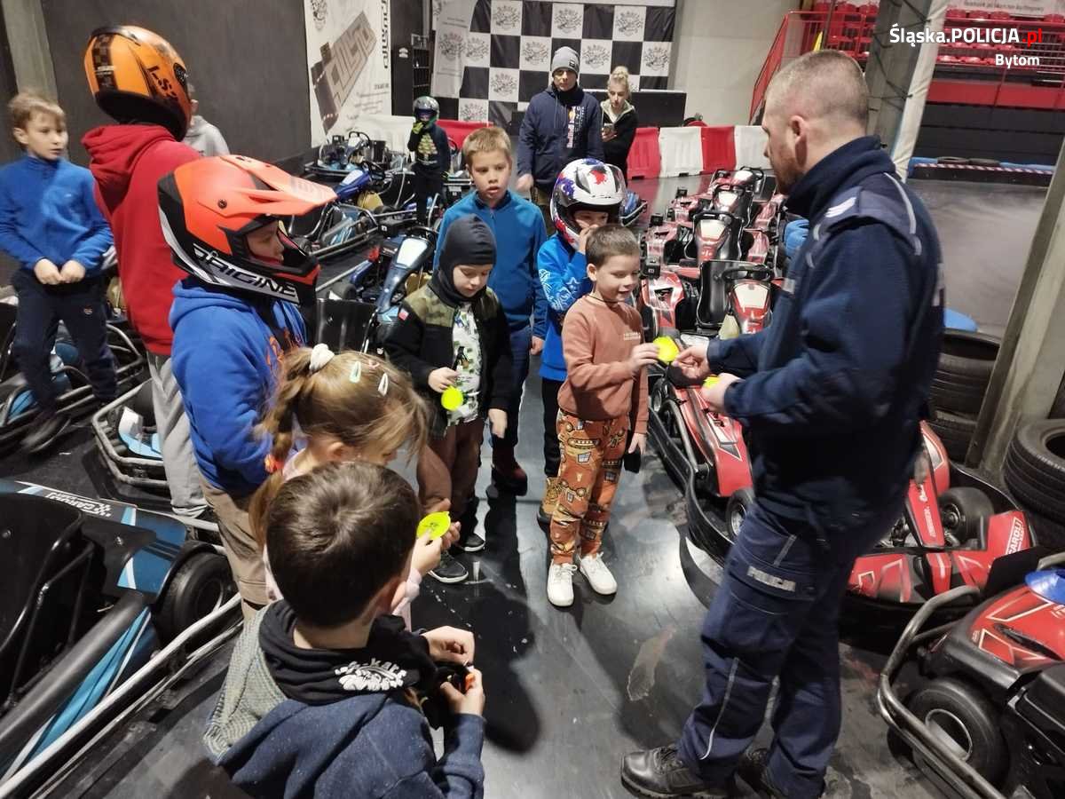 Policjanci z bytomskiej drogówki w ramach działań „Bezpieczne ferie 2024” spotkali się z uczestnikami półkolonii. Spotkanie odbyło się w nietypowym miejscu, bo na halowym torze kartingowym w Bytomiu. Policjanci przekazali dzieciom podstawowe informacje, dotyczące bezpieczeństwa na drodze, które z pewnością przydadzą się również po feriach.