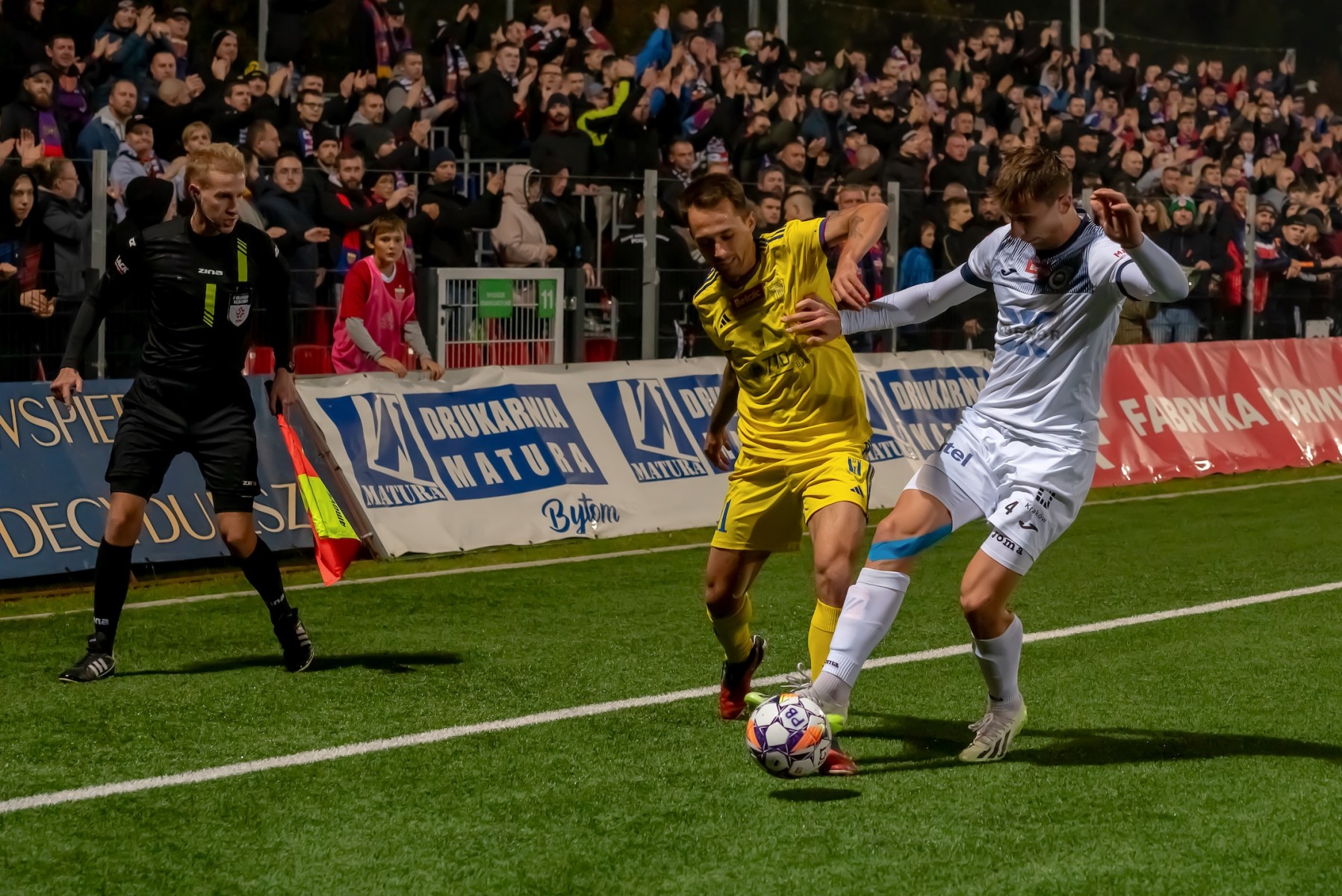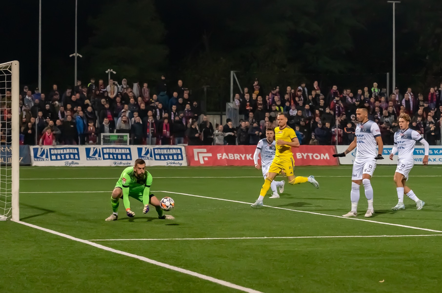 Sobotnie spotkanie rozegrane w świetle reflektorów dało wiele emocji zgromadzonym kibicom. Zdobyte dwie bramki to niejedyne akcje godne uznania. Do bramki podczas dzisiejszego spotkania dwukrotnie trafił Kamil Wojtyra. Pierwsza bramka padła po wspaniałej akcji bytomian w końcówce pierwszej połowy. Drugi raz piłkę w siatce gości Wojtyra umieścił w 62. minucie po strzale z rzutu karnego.
